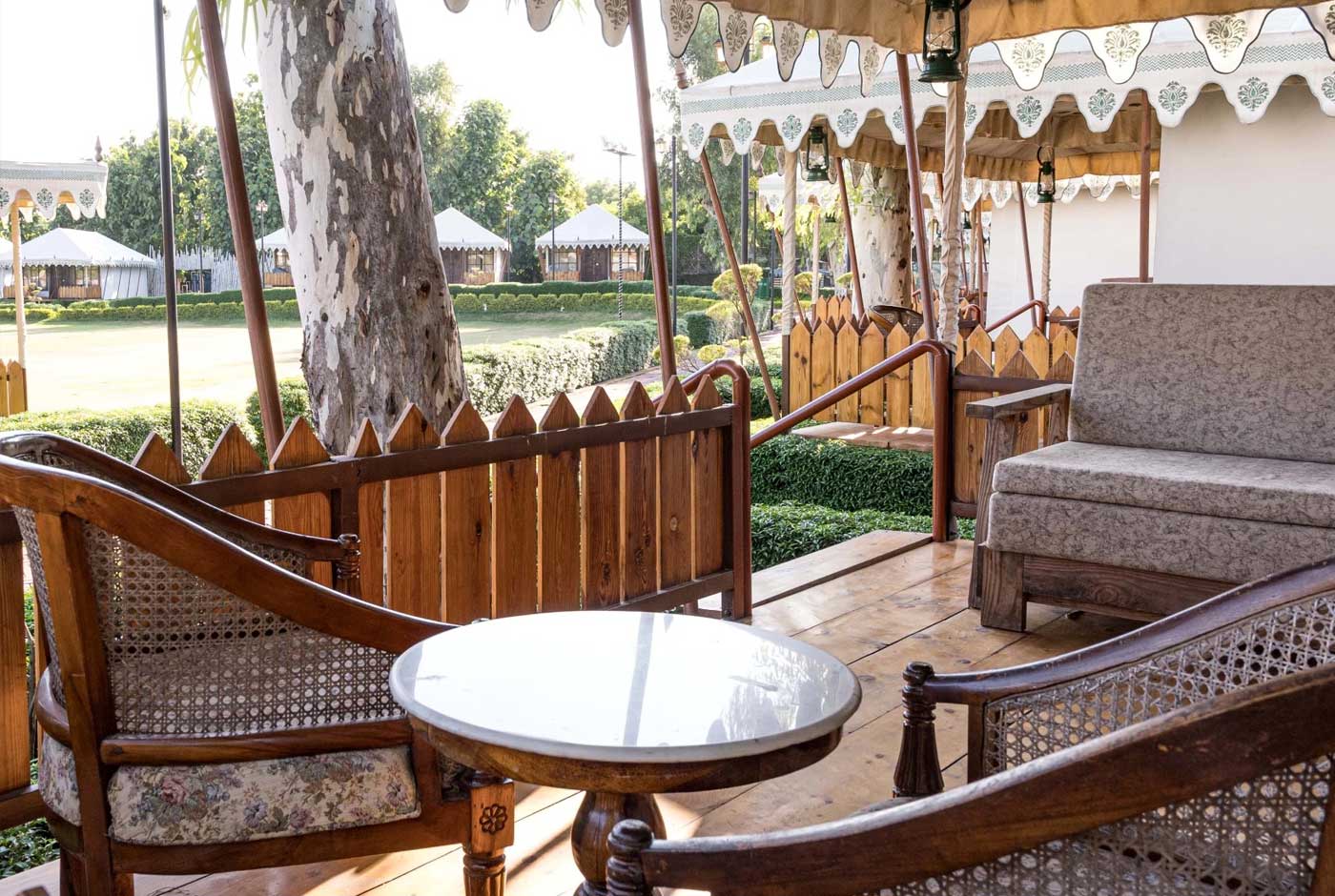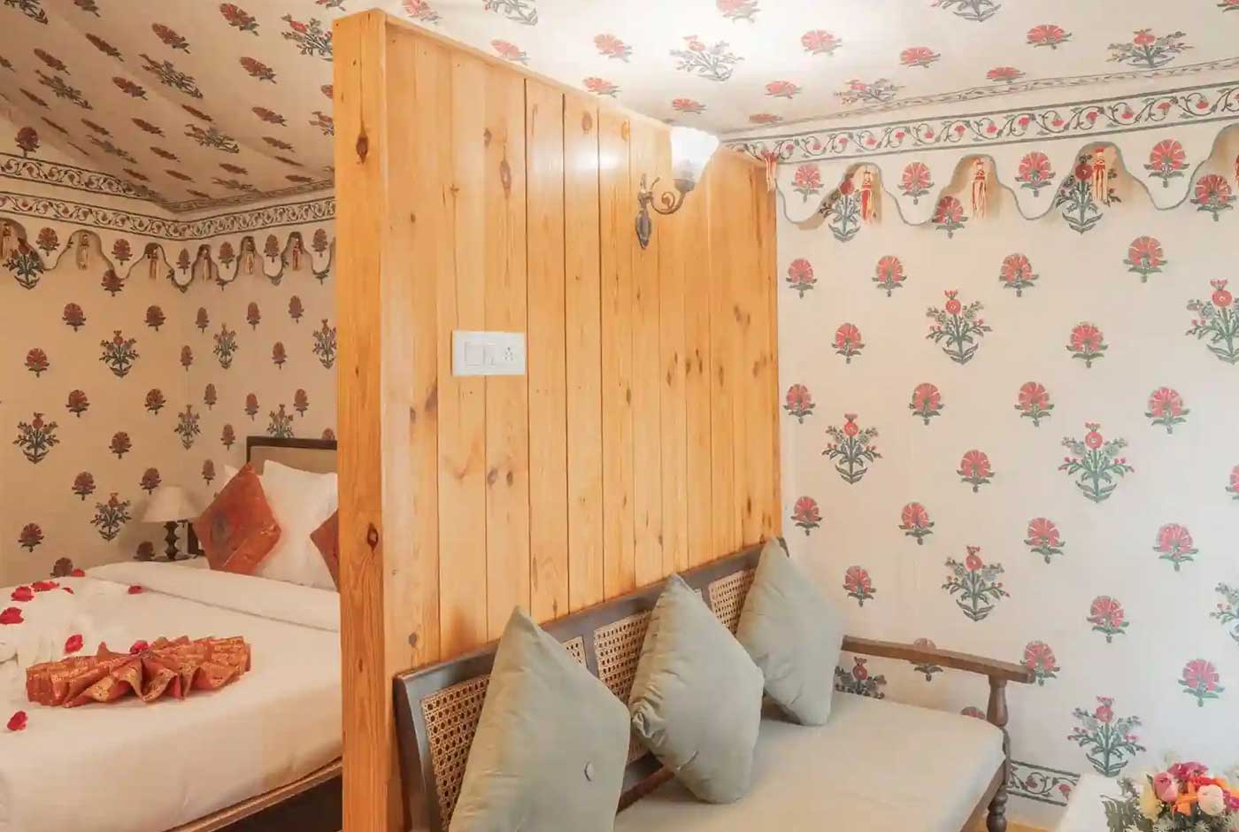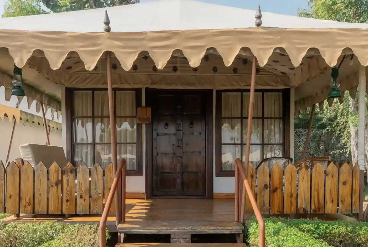 The Super Luxury Cottages at Om Vilas Benares exude a royal charm with elegant interiors, a warm cozy palette, and a touch of golden yellow. The custom-upholstered fabric of the tent showcases intricate paisley motifs, adding a timeless aesthetic. Complementing this, the modern wooden bathroom features a sleek sink and a spacious shower for a refreshing experience. Each cottage opens up to a serene expanse of lush greenery, offering a perfect blend of comfort and nature.