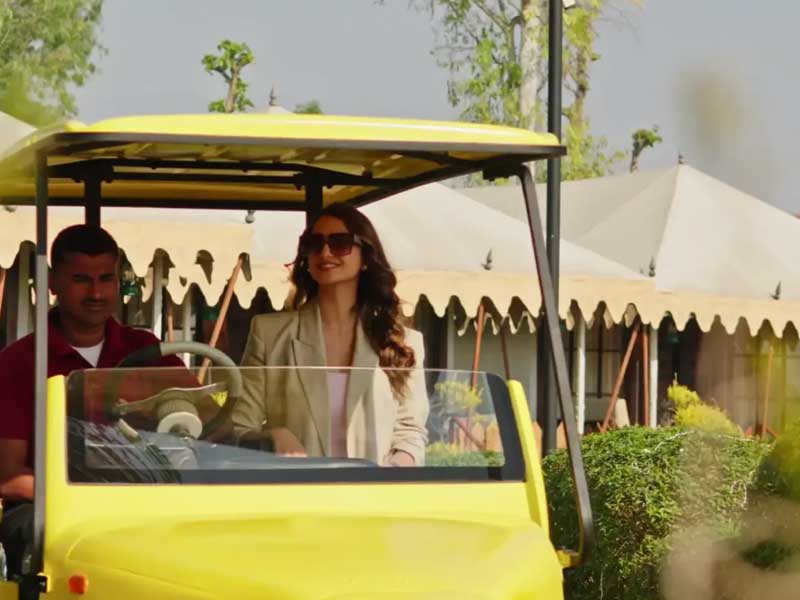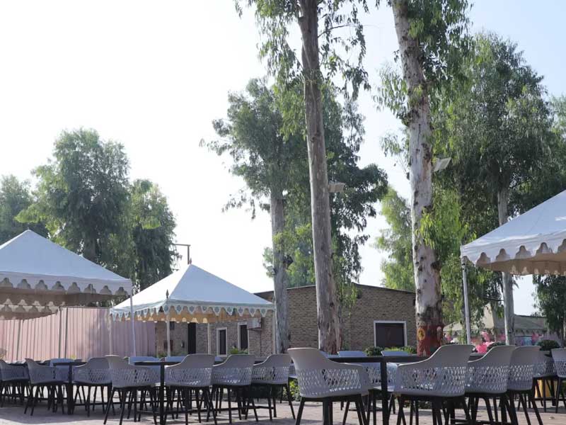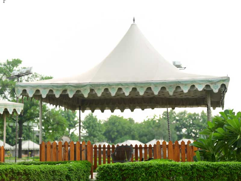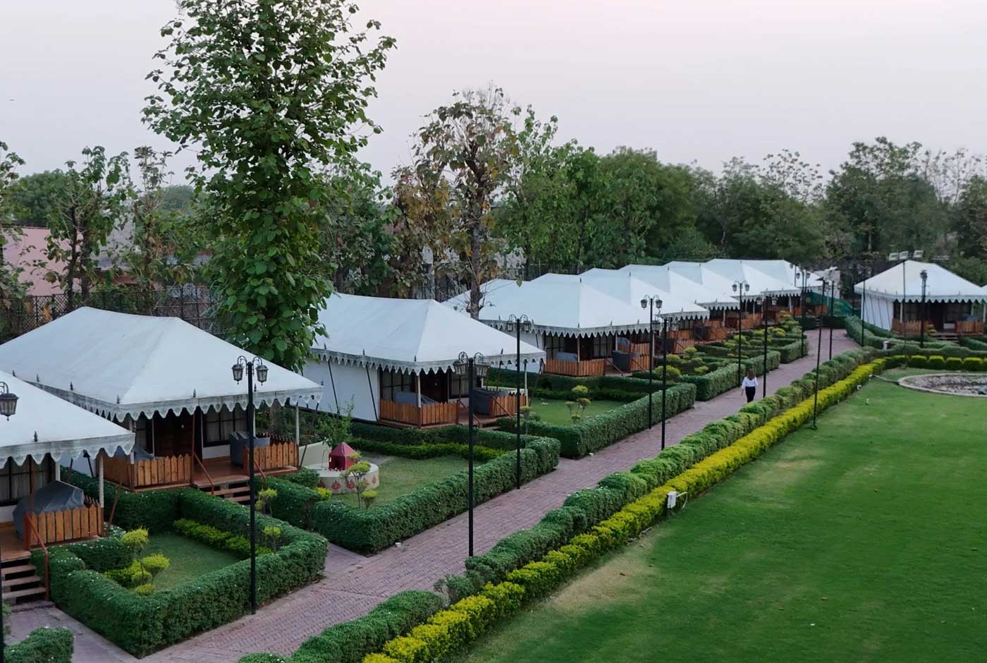 The Super Luxury Cottages at Om Vilas Benares exude a royal charm with elegant interiors, a warm cozy palette, and a touch of golden yellow. The custom-upholstered fabric of the tent showcases intricate paisley motifs, adding a timeless aesthetic. Complementing this, the modern wooden bathroom features a sleek sink and a spacious shower for a refreshing experience. Each cottage opens up to a serene expanse of lush greenery, offering a perfect blend of comfort and nature.
